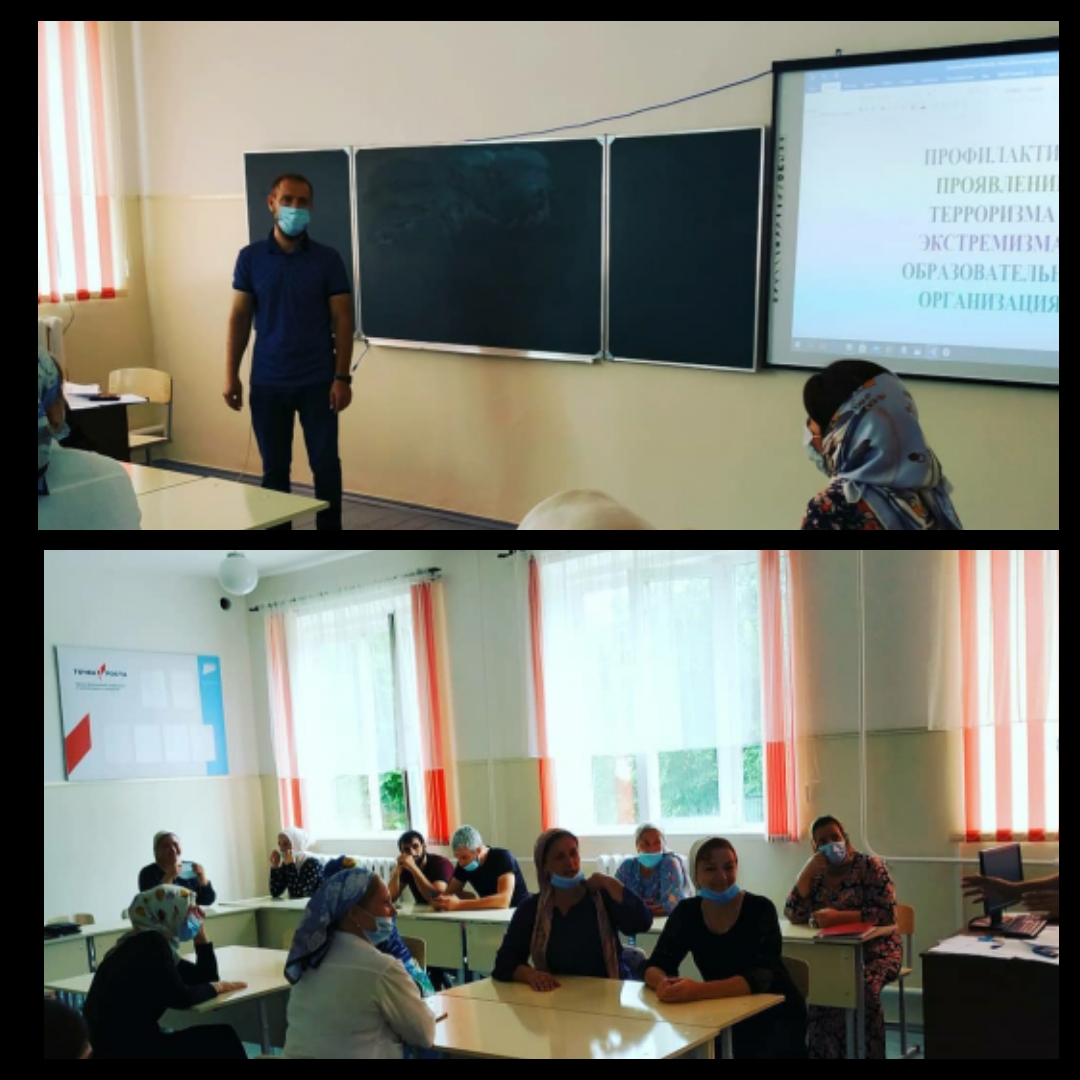 22.08.2020Во исполнение пункта 2.1 протокола заседания Национального антитеррористического комитета от 12 апреля 2016 года в МБОУ "Цоци-Юртовская СШ№1 им. Хамерзаева Х.А."22 августа была проведена профилактическая беседа по теме: "Проявления терроризма и экстремизма в образовательных организациях" с педагогами школы.